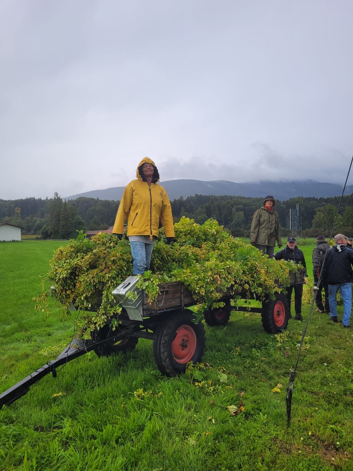 Trotz Regenwetter packten unsere fleißigen „Hopferer“ tatkräftig mit an und rissen die langen Triebe von Hand ab. Im Anschluss wurde die Ernte sorgfältig auf den bereitgestellten Hänger verladen und schließlich „standesgemäß“ vom Braumeister Löw in Empfang genommen.